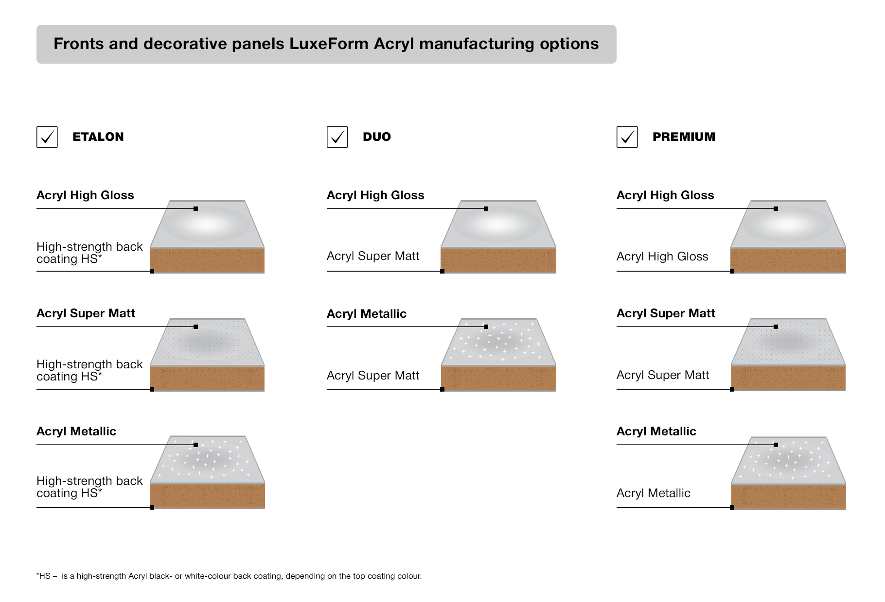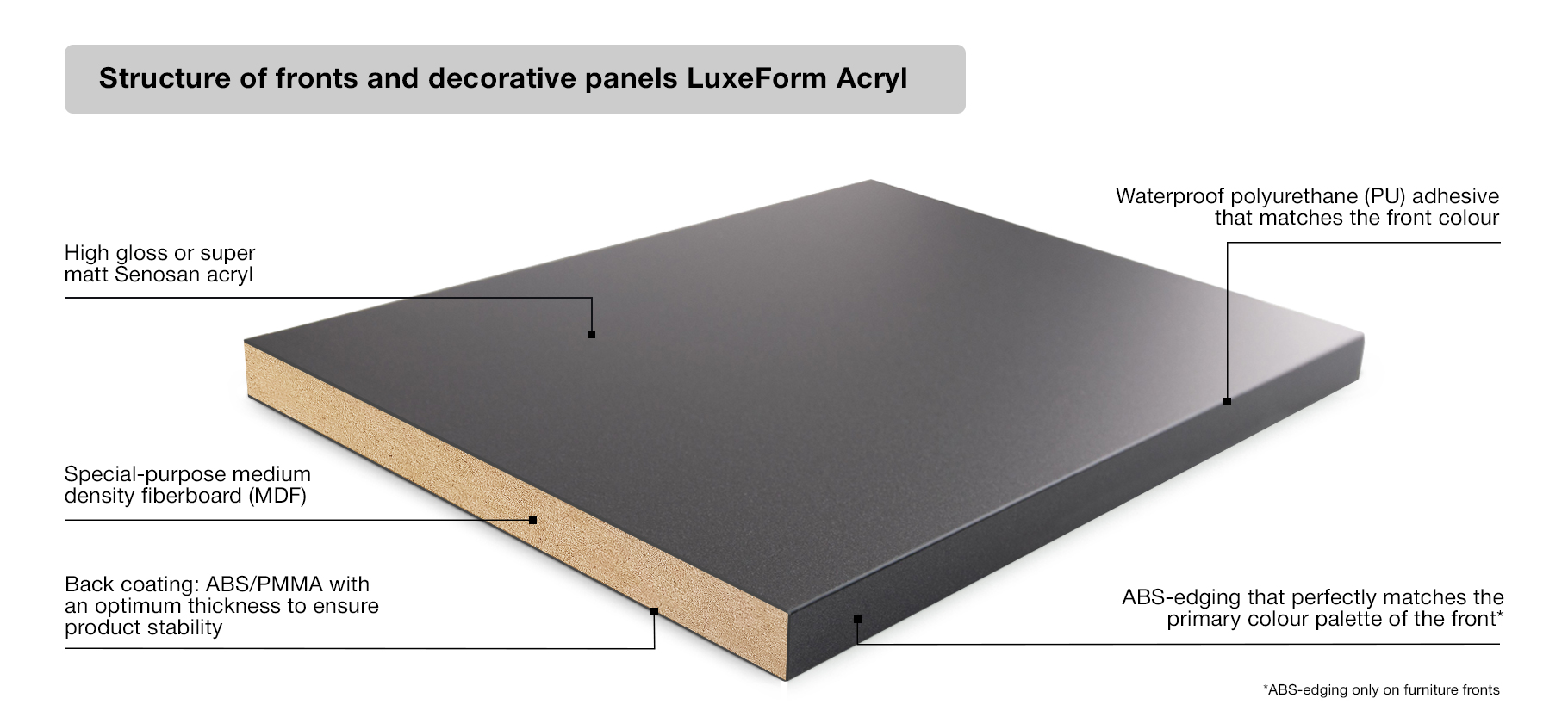 LuxeForm Acryl is a collection of decorative plates and fronts, distinguished by a stylish design and rich color. The mesmerizing and mysterious, harmonious and reliable surface of acrylic fronts fills the space, adds charm to the entire design.